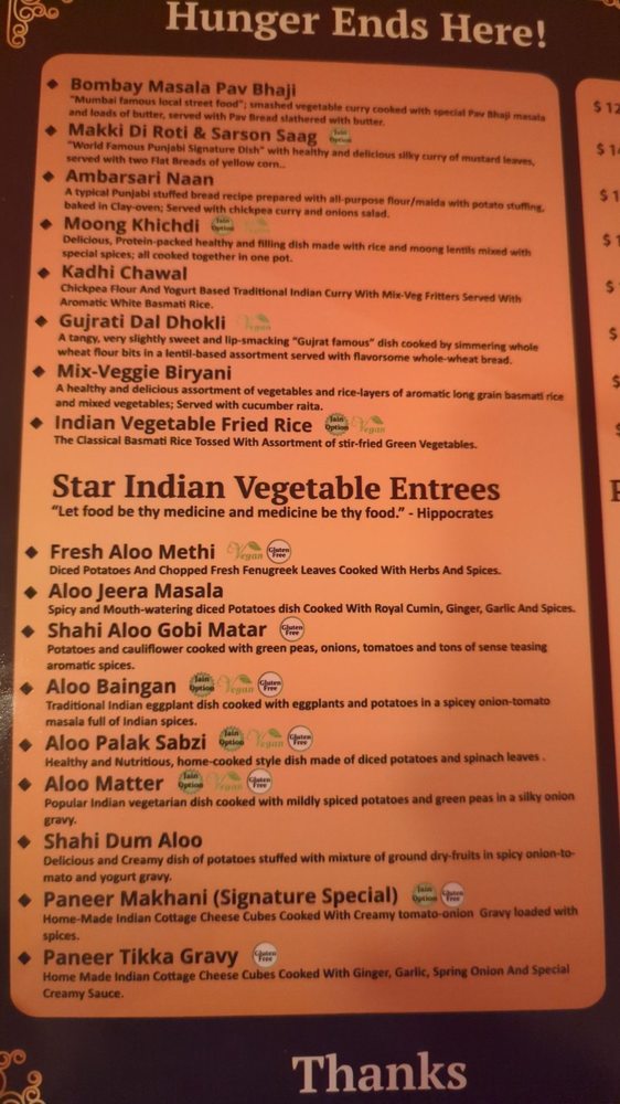 Star Chaat Cuisine offers a wide range of Indian vegetarian dishes with options for delivery, takeout, and catering. Located in Dublin, CA, this restaurant provides a welcoming environment with amenities like free Wi-Fi, outdoor seating, and gender-neutral restrooms. Notable dishes include Aloo Tikki Chole, Gajjar Halwa, and Kesar Pista Kulfi, all praised for their authentic flavors. Customers rave about the comforting saag, creamy korma, and perfectly risen bhature. The menu also features beverages like Badam Milk and masala chai. With positive reviews highlighting the exceptional service and attention to detail, Star Chaat Cuisine stands out for its dedication to traditional North Indian cuisine. Experience the true essence of Indian flavors at Star Chaat Cuisine.